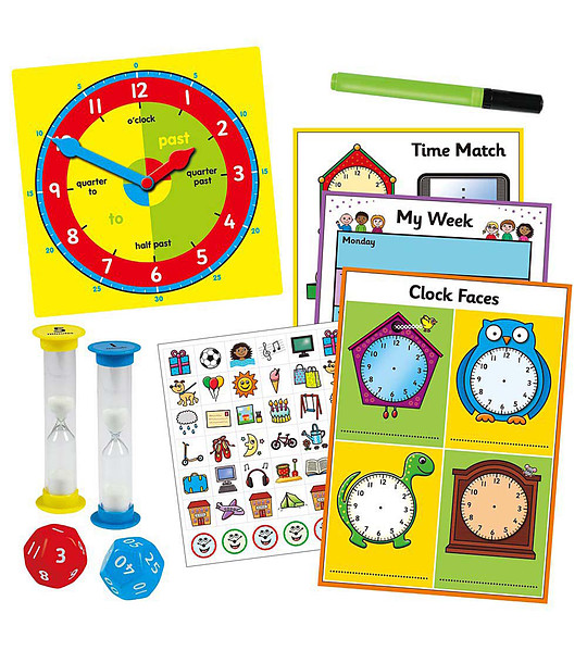 В комплектът има часовник с подвижни стрелки и пясъчен часовник. С двете зарчета и картинките могат да се играят различни игри с часовника.