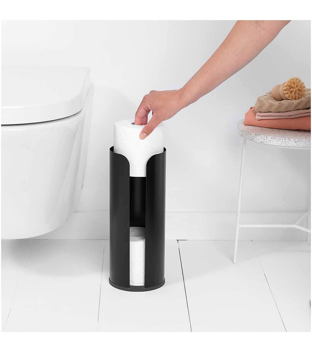Свободно-стоящият диспенсър за резервни рула тоалетна хартия на Brabantia е подходящ за съхранението на до три ролки тоалетна хартия.