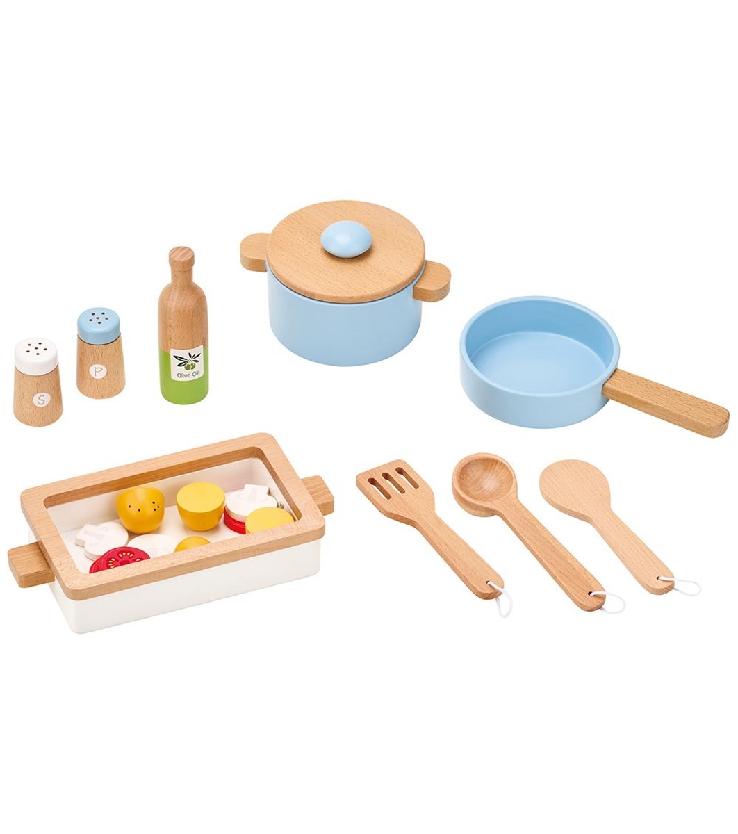 Lelin Toys дървеният комплект за готвене насърчава децата да развиват въображението, координацията между ръце и очи и социалните си умения чрез ролеви игри.