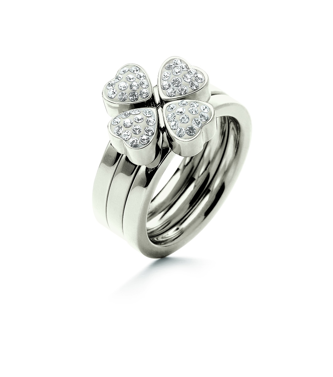 Пръстен с изчистен дизайн и четири сърца, декорирани с малки кристали. Моделът включва три съединени ленти, придаващи му елегантен вид.