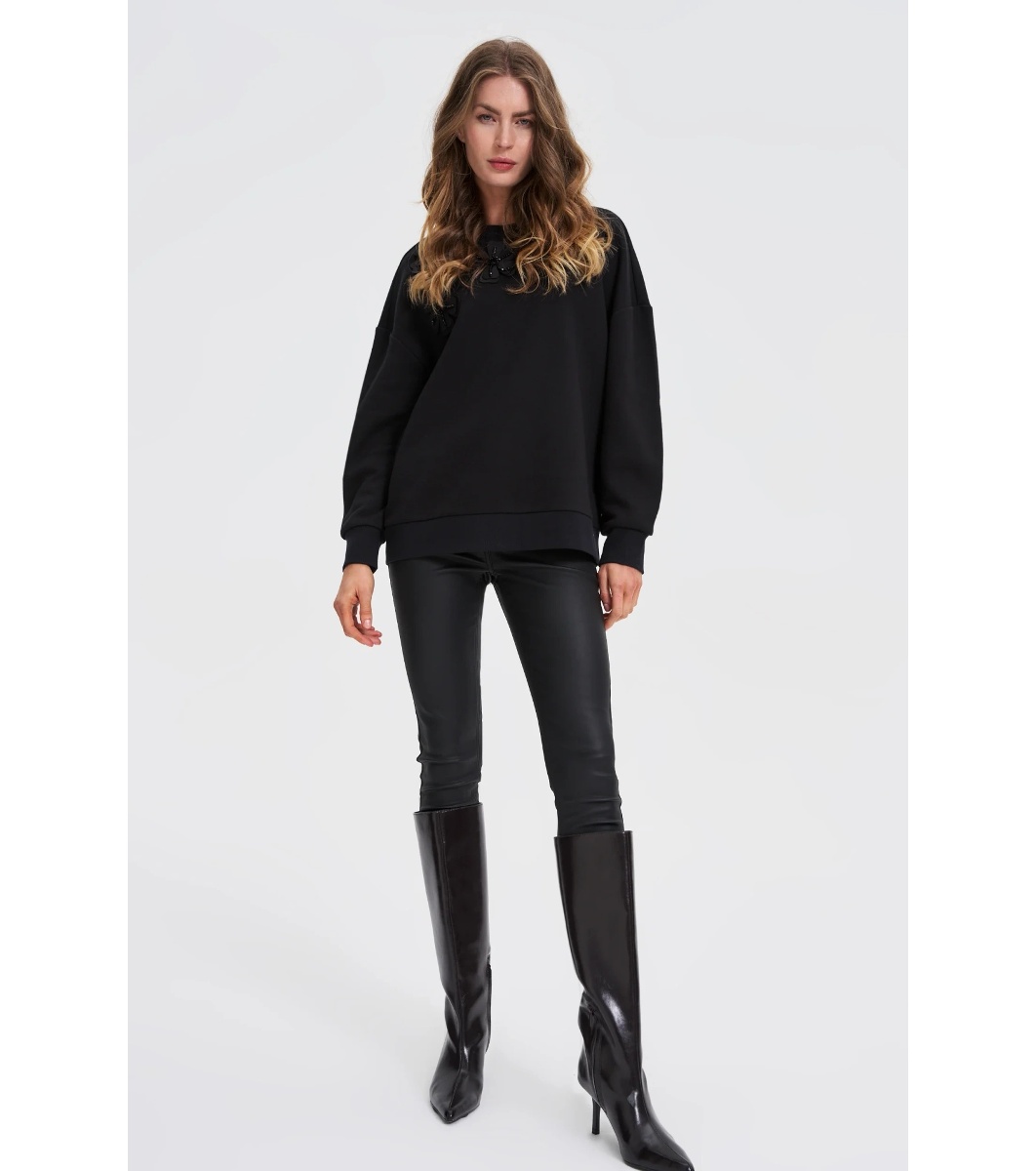 Черна дамска блуза с декоративни цветя